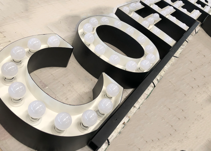 一种复古的工艺发光字,一般由金属底座和包边组成,光源则采用球形灯或钨丝灯等,发光高亮醒目。