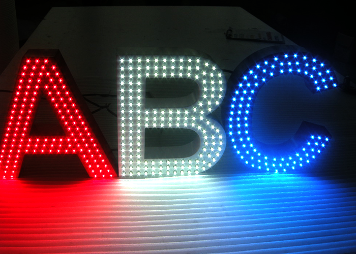 3、LED外露发光字:外露发光字按颜色分为单色,七彩,全彩发光字。单色LED发光字是由打好孔的字壳,和单色外漏灯组成。七彩外露发光字是由打好孔的字壳,和七彩外漏灯,七彩控制器构成,打灯之后可以七彩渐变。全彩LED外露发光字由打好孔的字壳,和全彩外漏灯,全彩控制器构成,利用专业软件制作程序文件置入SD卡,SD卡插入全彩控制器,打灯之后外漏发光字,可以播放FLASH动画,人物动画,效果档次极高。LED外露发光字合适使用在室外。
