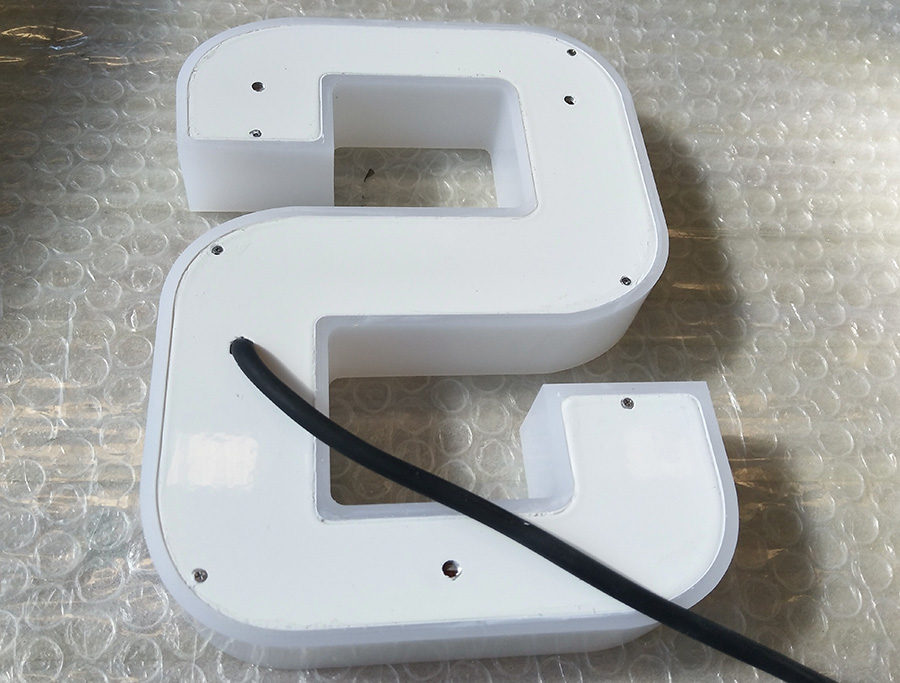无边字是由亚克力面板、底盒和LED灯组成,面板是亚克力板通过雕刻机雕刻槽和轮廓,底盒焊接后装入LED灯,套入面板后由有机药水固定。无边字的特点在于无胶边/金属边,正面观望只有亚克力板。